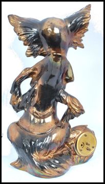 A vintage 20th century retro ceramic clock in the form of a fox having an inset Mercedes clock to tail. Measures 42.5 cm high.
