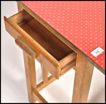 A retro 1950's red formica and beech wood drop leaf harvest table. The red formica top raised on gate leg action with cutlery drawer to one end. Measures 77cm x 76cm.