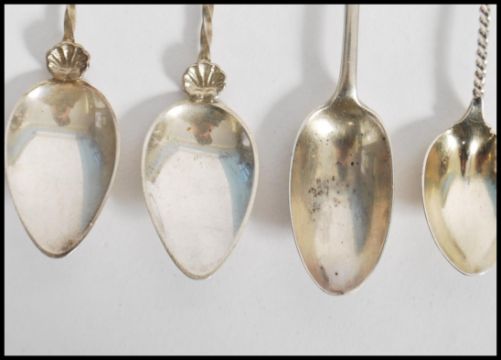A collection of 10 sterling silver tea spoons with twizzle handles and lozenge shaped bowls. Stamped to the base underside Sterling. Total weight 75.1g. Also a pair of silver Maltese 917 marked teaspoons, weight 17.5g and a Victorian London hallmarked teaspoons 10.6g