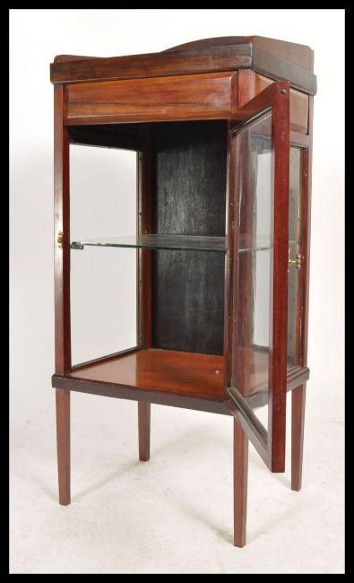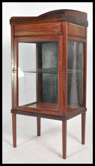 A mahogany 20th century bijouterie upright pedestal display cabinet raised on squared legs with panel glass sides and front with gallery top above.