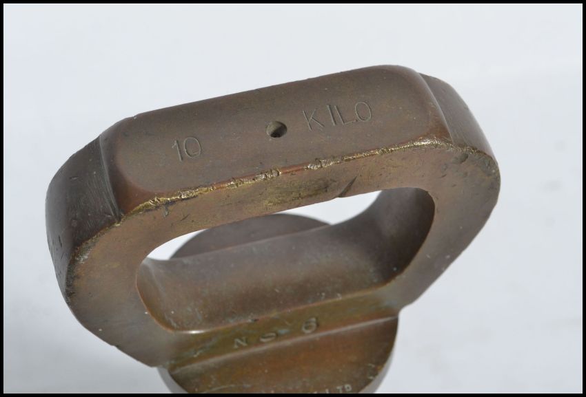A large antique Avery Ltd bronze 10 kilogram weight of bell / pawn form. The weight stamped Avery No 6.
