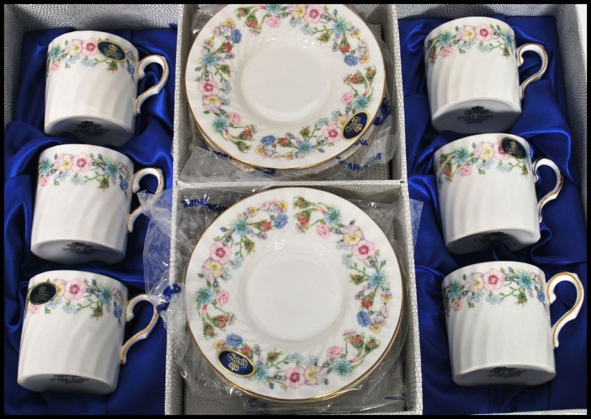 A cased set of six late 20th century bone China unused coffee cans with saucers by Aynsley in the Wild Tudor pattern retaining the original presentation case.
