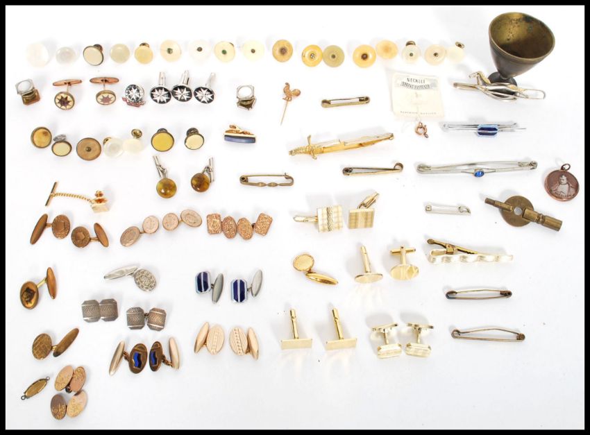 A large collection of vintage 20th century cuff links, buttons , tie clips etc. Many pairs and examples please see images. Measures 5 cm high and 5 cm diameter.