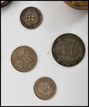A continental silver 800 pocket watch along with a gold tone metal sovereign holder a Victorian 1887 coin bar brooch, and various other coins and coin necklaces.