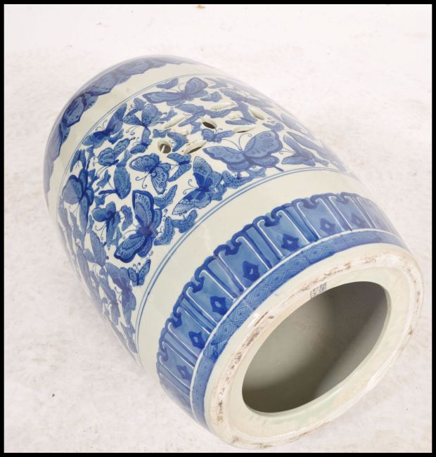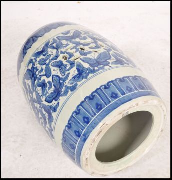 A 20th century Chinese blue and white ceramic barrel stool - stand. Barrel form with pierced top having blue and white decoration. Measures 45cm x 35cm.
