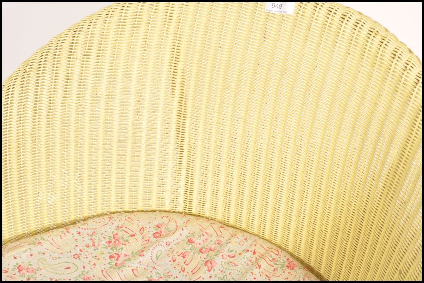 A vintage mid century rattan weave style bedroom chair in yellow colourway with fabric cushion seat and raised on tubular metal legs. Measures 74cm high x 69cm wide x 54cm deep.