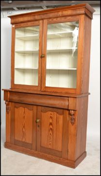 A good Victorian pitch pine and mahogany country dresser - cabinet. The base raised on plinth base with large single drawer over cupboard beneath. Above a glazed display cabinet with twin doors and flared cornice atop. Measures 201cm x 130cm x 48cm.