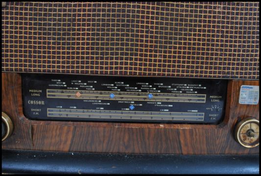 A vintage 1940's walnut cased Cossor Melody Master 523 valve radio with decorative dial and facia believed to be in working order