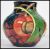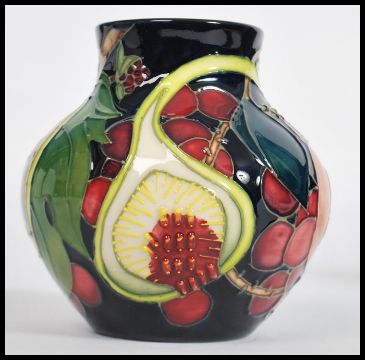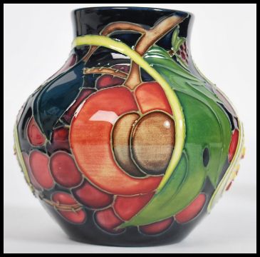 A Moorcroft ceramic vase tube lined decorated with flowers in the Queens Choice pattern complete in original box C2000 scissor marks and signatures to verso Baluster form with a short waisted neck, painted in colours on a midnight blue ground and decorated with stylised flowers and berries, Measures 9cm high.