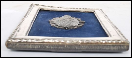 A vintage cast white metal brooch depicting the bust of Elizabeth I with inscription to the outside reading ELIZABETHA DGANDFRAET HIB REGINA, mounted on a blue velvet panel and framed within a silver hallmarked frame. Measures 17 cm high.