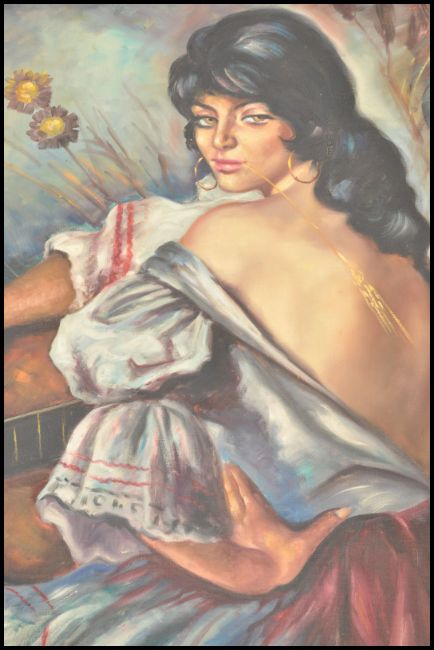 Spanish School, A mid 20th century retro large oil on panel painting portrait study of a Flamenco Dancer being , indistinctly signed to the corner. Measures 90cm x 72cm.