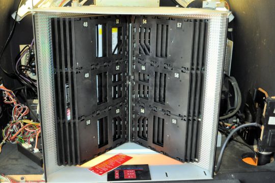 A vintage 1980's Rowe Ami HCD-1 CD Hideaway Phonograph Jukebox 100 Carousel in the form of a curved top 1960's record jukebox with neon lights to front. The open glass front revealing storage and selection for 100 CD's. Condition Report. Appears to light up and function correctly.