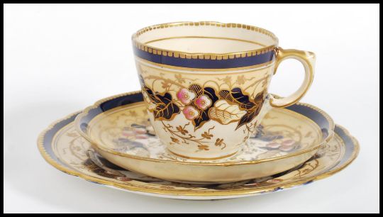A 19th century Victorian Worcester cup saucer, lidded sugar bowl and creamer milk jug in a matching floral pattern with gilt decoration and green Worcester marks for 1864 along with a pair of 19th century cup saucer and side plate trios having an ivory blush ground with cobalt decoration. Painted 4569 marks to bases.