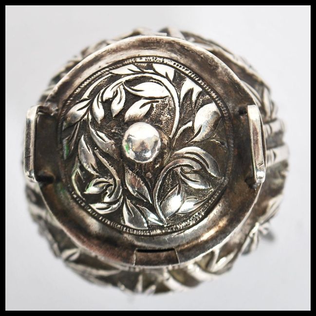 An unusual 19th century Chinese silver condiment in the form of a censer ding bowl raised on tripod legs with relief foliate decoration. Weighs 15.7 grams. Measures 5 cm high.