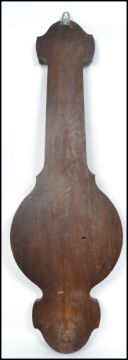 A Oak Cased Banjo Barometer, circa 1920's with poker work carving, thermometer to neck, silvered dial with Kendal & Dent, London to the face. Measures 83 cm high and 27 cm wide.