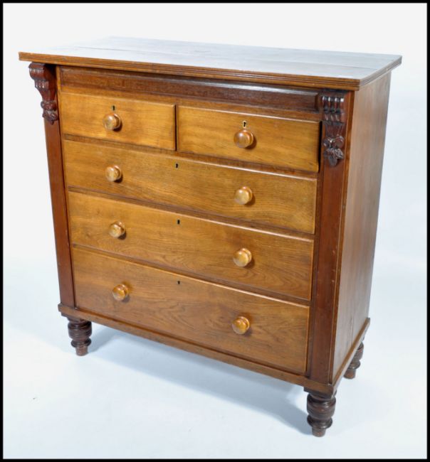 A Victorian mahogany Scottish chest of drawers being raised on turned legs with short and deep drawers configuration, embellished columns with flared top above. Measures 131cm x 124cm x 56cm.