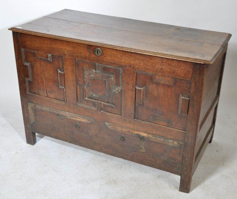 An 18th century carved oak faux mule chest coffer. Being raised on stile legs with geometric panel moulded facia over faux drawers having a hinged top over open storage within