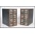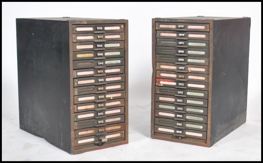 A pair of mid century Industrial black metal filing index cabinets with 14 drawers to each with green fascias and index handles. applied plaque to the front for Kardex . Matching pair in lot 1147. Measures 62cms by 33cms by 61cms.