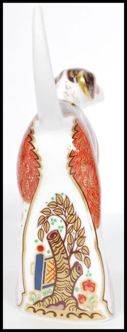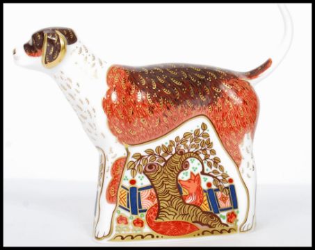 A Royal Crown Derby paperweight of a dog, Foxhound, with gold stopper, red stamp to base, dated to 2010. Measures 15cm high.