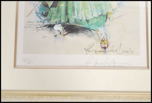 A collection of three Raymond Hughes framed and glazed limited edition prints of costume studies decorated with fabric samples, from editions of 500, signed and in gilt frames. 70cms high x 52cms wide each