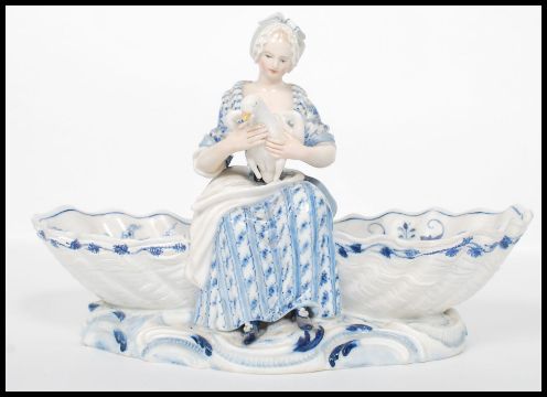 A 19th century Meissen figural table salt modelled as a young girl holding a goose seated between two scalloped baskets painted predominantly in blue on an oval scrolled base 12.5cm high blue crossed swords mark incised no.27 and impressed 681. Measures 16cm x 25cm.