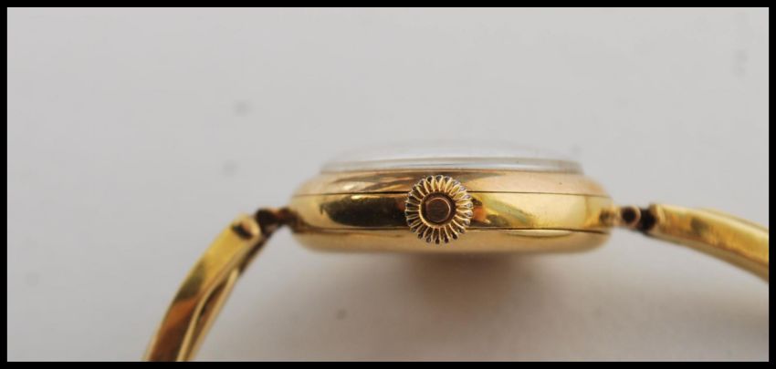 A hallmarked 18ct gold vintage 20th century cocktail watch set to an 18ct gold stamped expanding watch bracelet. The silvered dial with subsidiary seconds dial roman numeral chapter ring and faceted hands. Weighs 20.9 grams.