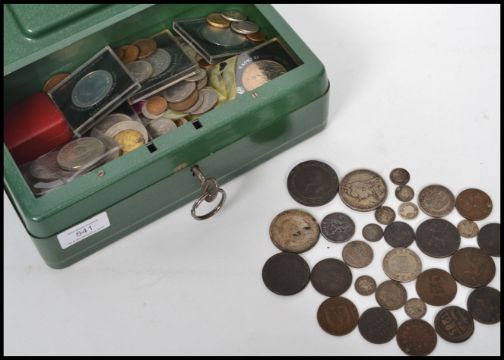 A collection of vintage coins dating from the 18th century to include a Georgian 1797 cartwheel penny, a 1892 silver Victorian crown coin, 1836 Georgian coin, 1816 Georgian coin, 1937 Crown, 1841 four pence, 1807 penny, unusual tokens, German 1936 coin, another Cartwheel coin AF, 1858 penny, 1812 Hull half penny, 1864 Napoleon coin, Many Georgian coins and later examples, Please see images. All held within a good green metal locking money tin.