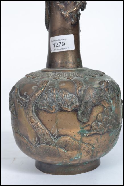 A 19th century Chinese bronze vase embellished with dragons to the tall waisted neck over a bulbous base with further decoration of birds, trees and geometric design. Raised on a circular foot being unmarked