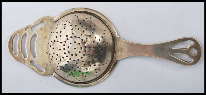 A silver hallmarked tea strainer bearing hallmarks for Birmingham. Weighs 26.6 grams. Measures 14 cm long.