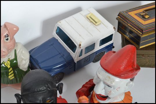 A collection of vintage 20th century money boxes to include cast metal, Dusty Bin, A.L.F, Natwest pigs etc please refer to images.
