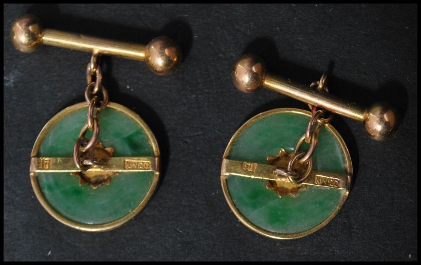 A pair of vintage Chinese 18ct gold and jade cuffs / cuff links of roundel form having ball ended bards. Weighs 8.6 grams.