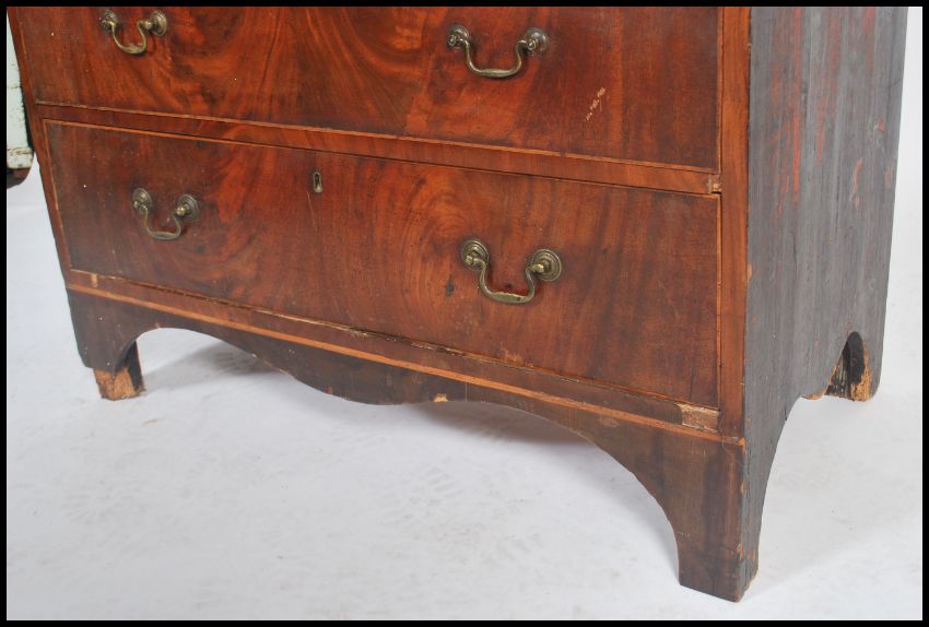 A 19th century Georgian mahogany inlaid chest of drawers having brass swan neck handles with straight 4 configuration with flared inlaid flame mahogany top above. Measures: 78cm high x 102cm wide x 50cm deep.