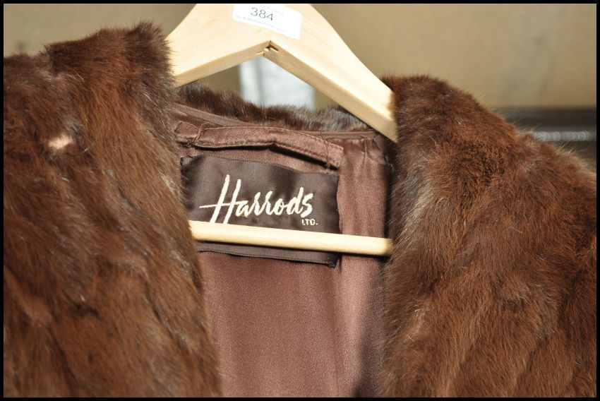 A vintage mid 20th century ladies dark mink coat, retailed by Harrods The three quarter length mink with a short lapel and full length sleeves, Harrods label to lining