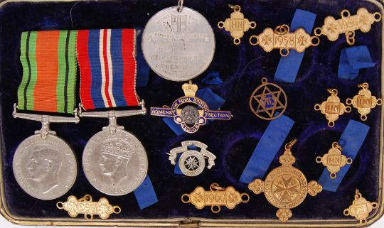 A collection of WWII Second World War medals & other related items to include; 1939-1945 medal, The Defence Medal, 1935 Silver Jubilee Commemorative medal, Women's Section of The Royal British Legion pin badge, St. John's Ambulance recognition medal awarded to A199192 Margarette E Gale, 1956, 1958, 1960 bars & others. Presumed unrelated.