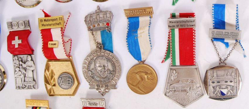 A collection of original 1970's Swiss Sporting & Agricultural medals to include; Skiing, Alpine Lodges, Farm Scenes, Auszeichnung, Motorsport, Int. Volksmarsch, and others. All with on their original ribbons.