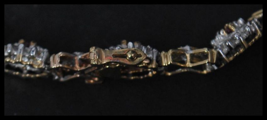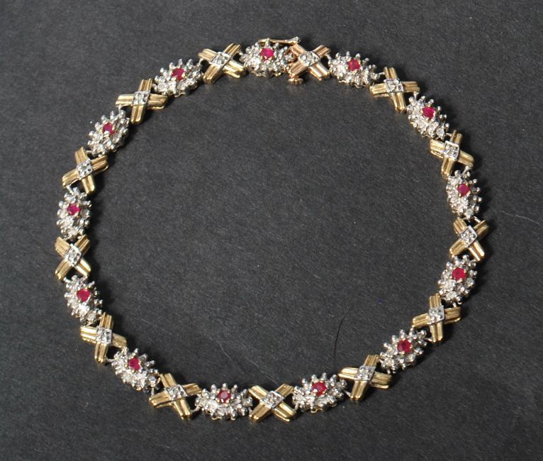A hallmarked 9ct white and yellow gold ruby and diamond bracelet set with gold kiss and cluster settings . Set with 13 round cut rubies and approx 60pts diamonds. Measures 7 3/4 inches. Hallmarked import marks Birmingham. Weight 8.3g