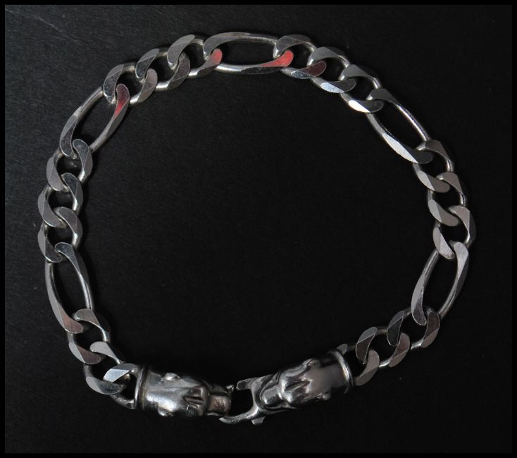A hallmarked 925 silver Figaro chain bracelet with panther head finial clasp. Measures 7.5 inches. Weight 16g