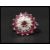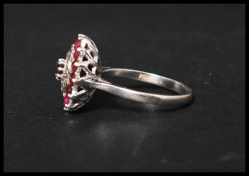 A hallmarked 18ct white gold ruby and diamond cluster ring having a central raised ruby in claw setting surrounded by eight illusion set diamonds, with an outer halo of 14 round rubies in claw settings. Total weight 6.1gms. Size O.