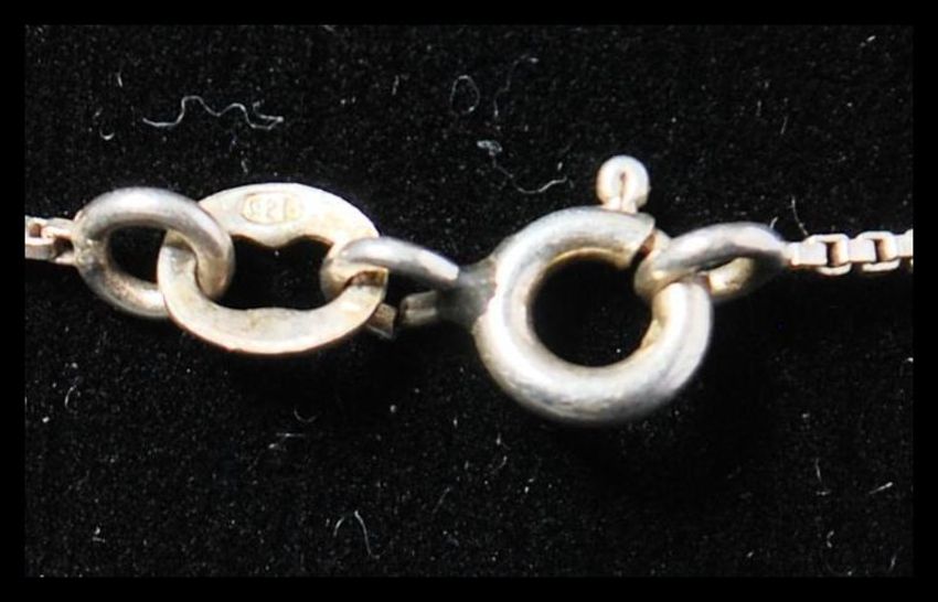 A 925 silver pendant necklace strung with an amber set  block pendant. Marked 925 to pendant and chain.