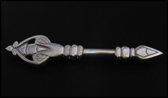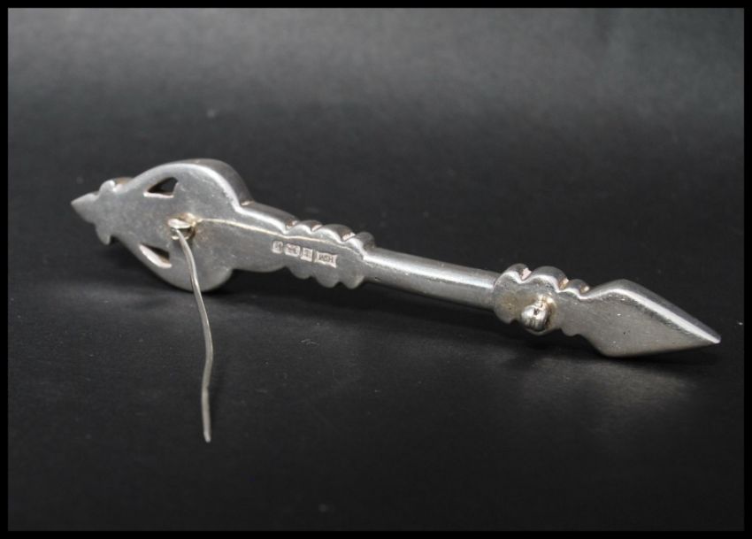 A heavy hallmarked 925 silver kilt or brooch pin in the form of a dagger or staff with roller clip clasp. Hallmarked Birmingham. Measures 10cms. Weight 64g.
