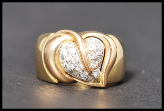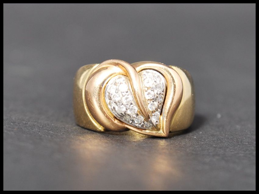 A hallmarked 18ct gold and white stone Italian designer dress ring. The ring decorated with a  pave set heart vine. Marked 750 Premier *1343 VI for Vicencza. Weight 9.7g. Size N.