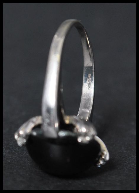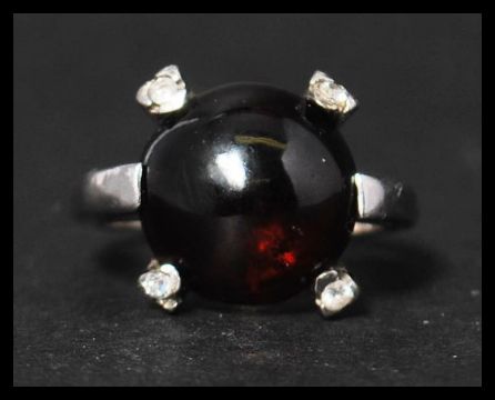 A hallmarked 9ct white gold, garnet and white stone ring set with a garnet cabochon with four accent white stones. Hallmarked London. Size L. Weight 4.5g.