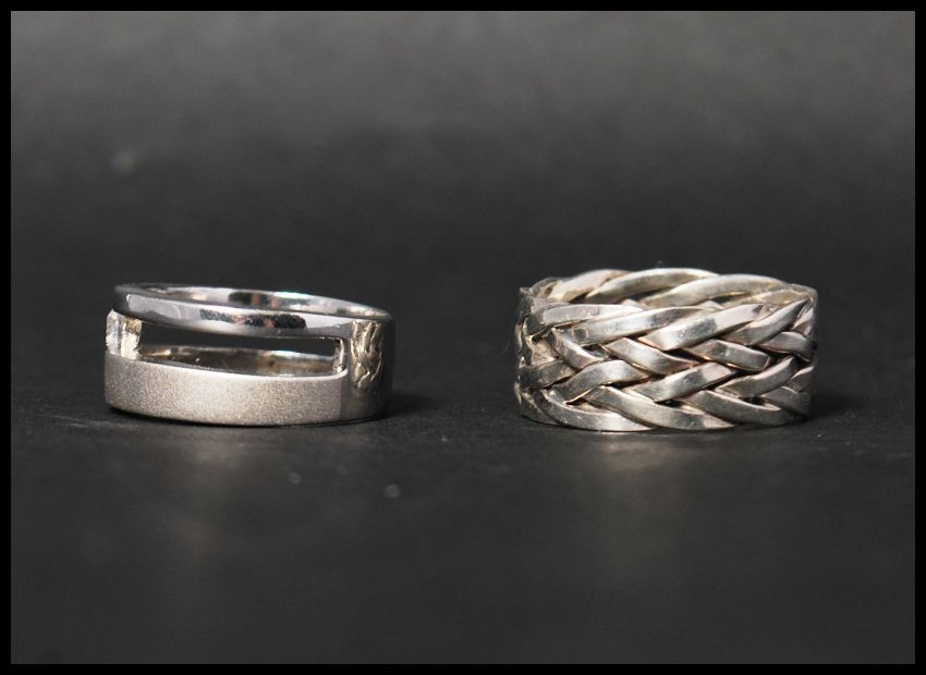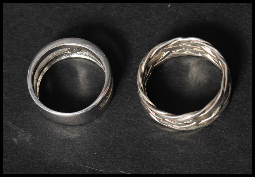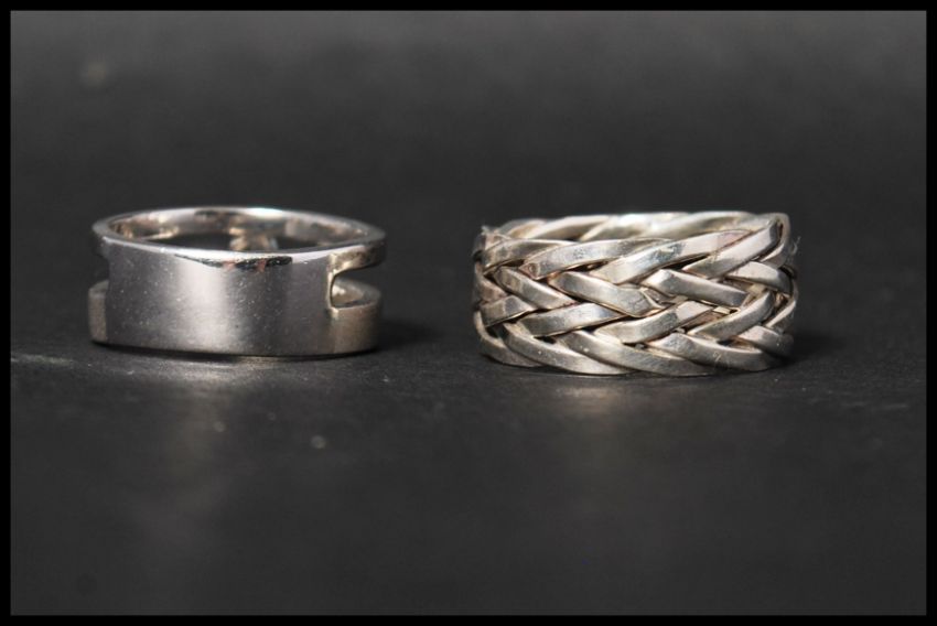 Two 925 silver band rings one having a weave design the other having a suspension set white stone. Marked 925. Sizes Weave S, Suspension O.