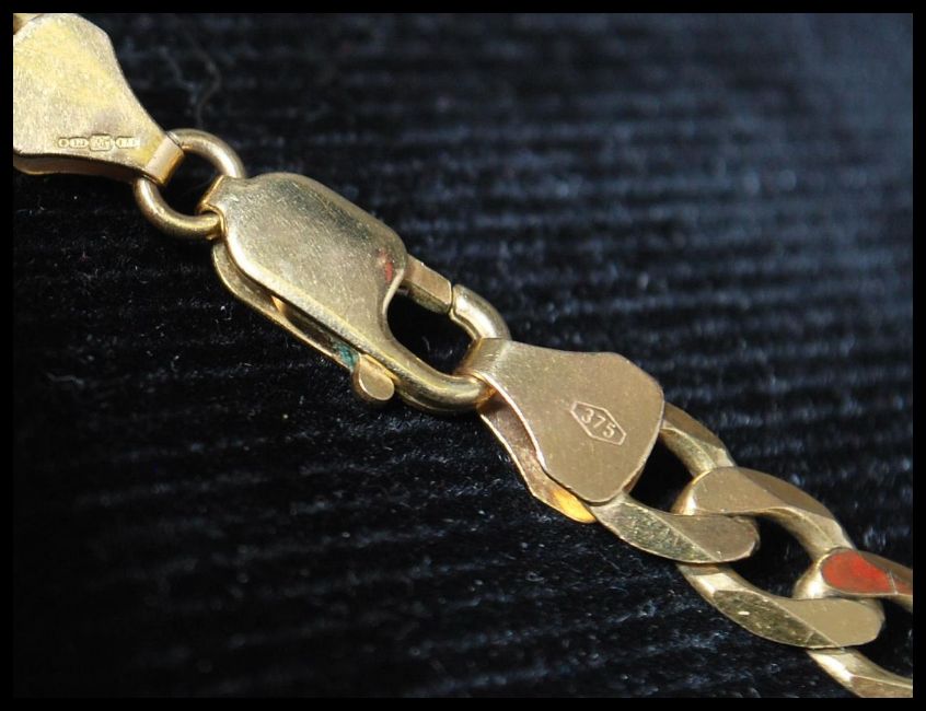 A hallmarked 9ct gold flat curb link chain necklace having a lobster claw clasp. Hallmarked London. Measures 20inches. Weight 25.8g.