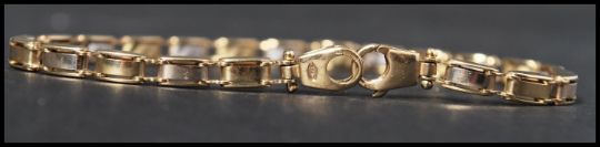 A hallmarked white and yellow gold bracelet with alternating white and yellow gold frosted chevron links with lobster claw clasp. Hallmarked London. Measures 7.5 inches. Weight 7g.