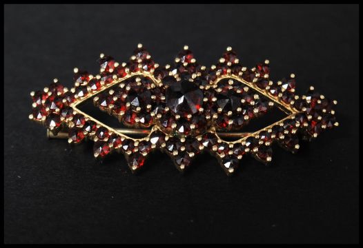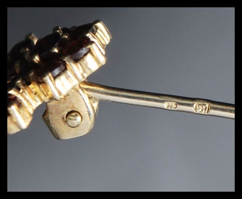 A 925 silver vermeil bohemian garnet brooch having a trombone clasp. Marked HG 925.