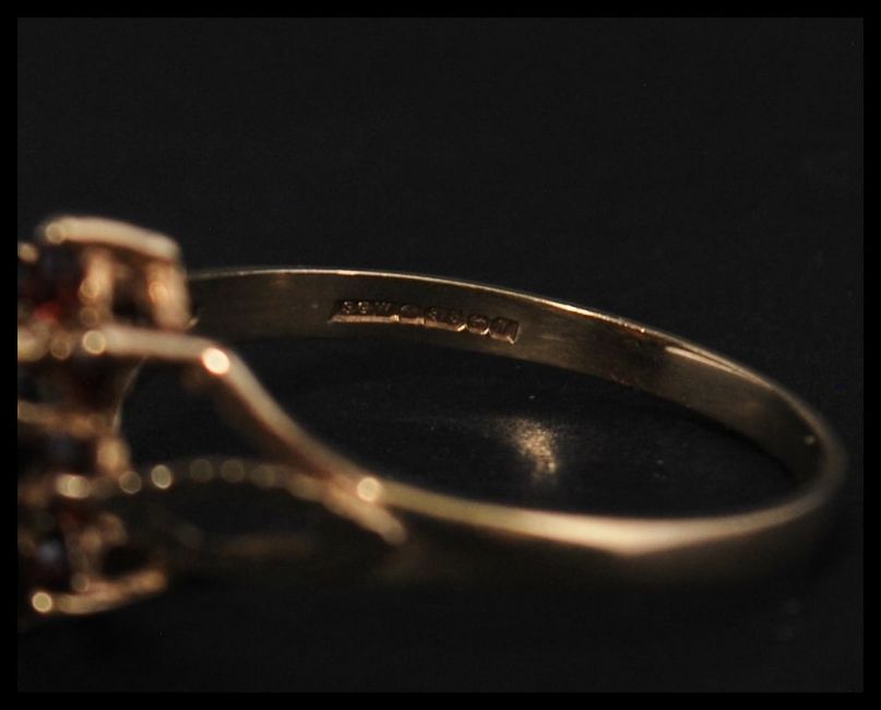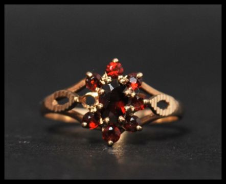 A hallmarked 9ct gold and garnet cluster ring with diamond cut pierced shoulders. Hallmarked Birmingham. Size R. Weight 2g. (One stone missing)