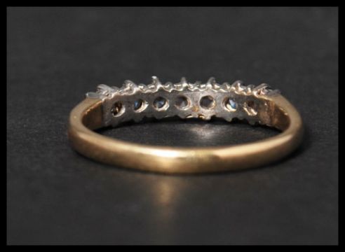 A hallmarked 9ct gold and white stone ring set with 7 white stones. Hallmarked Sheffield. Weight 2.7g. Size R.