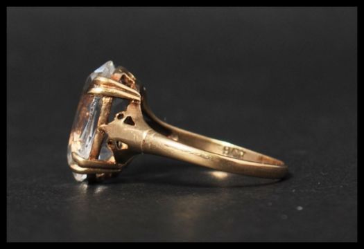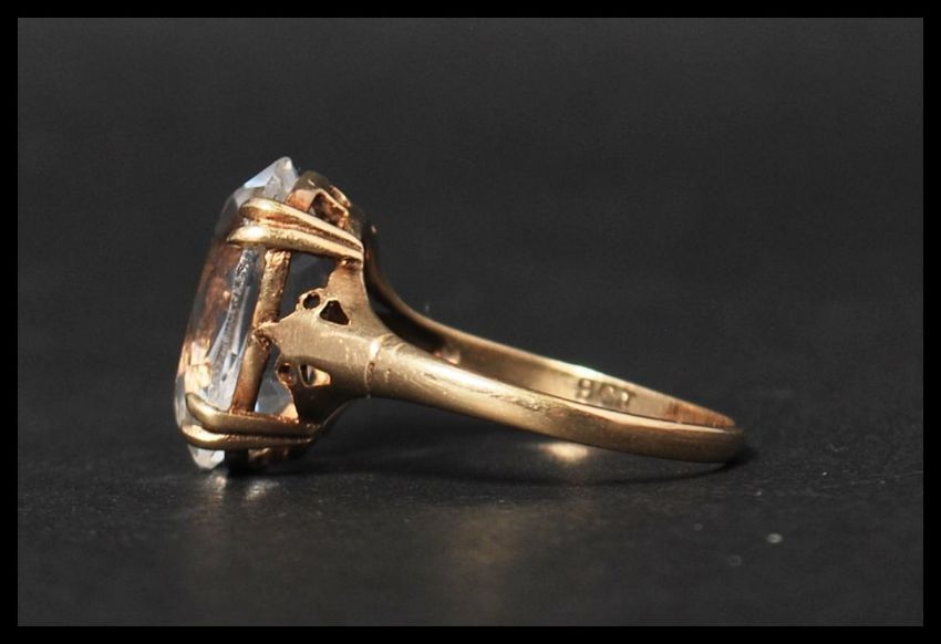 A 9ct gold vintage dress ring set with a large oval cut white stone having stylised shoulders. Marked 9ct tests 9ct gold. Weight 2.5g. Size N.