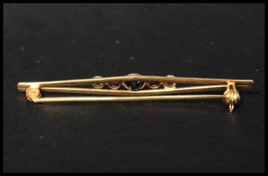 An 18ct gold 5 stone bar brooch being set with a central blue sapphire flanked by two pink sapphires and two white stones having a roller clip clasp. Marked 750, tests 18ct gold. Measures 5cms. Weight 2.8g.